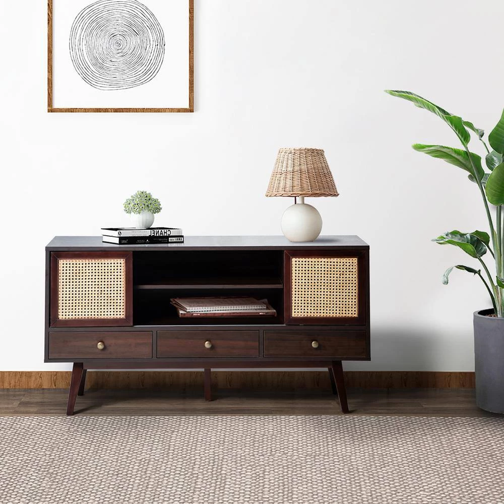 - √ Ample Storage Space: Simply push the two exquisite rattan doors sliding in a smooth metal glide to reveal large storage space. Behind it is a middle interior shelf and two compartments, convenient for holding your DVDs and gaming consoles while the three drawers below are for other living room essentials.