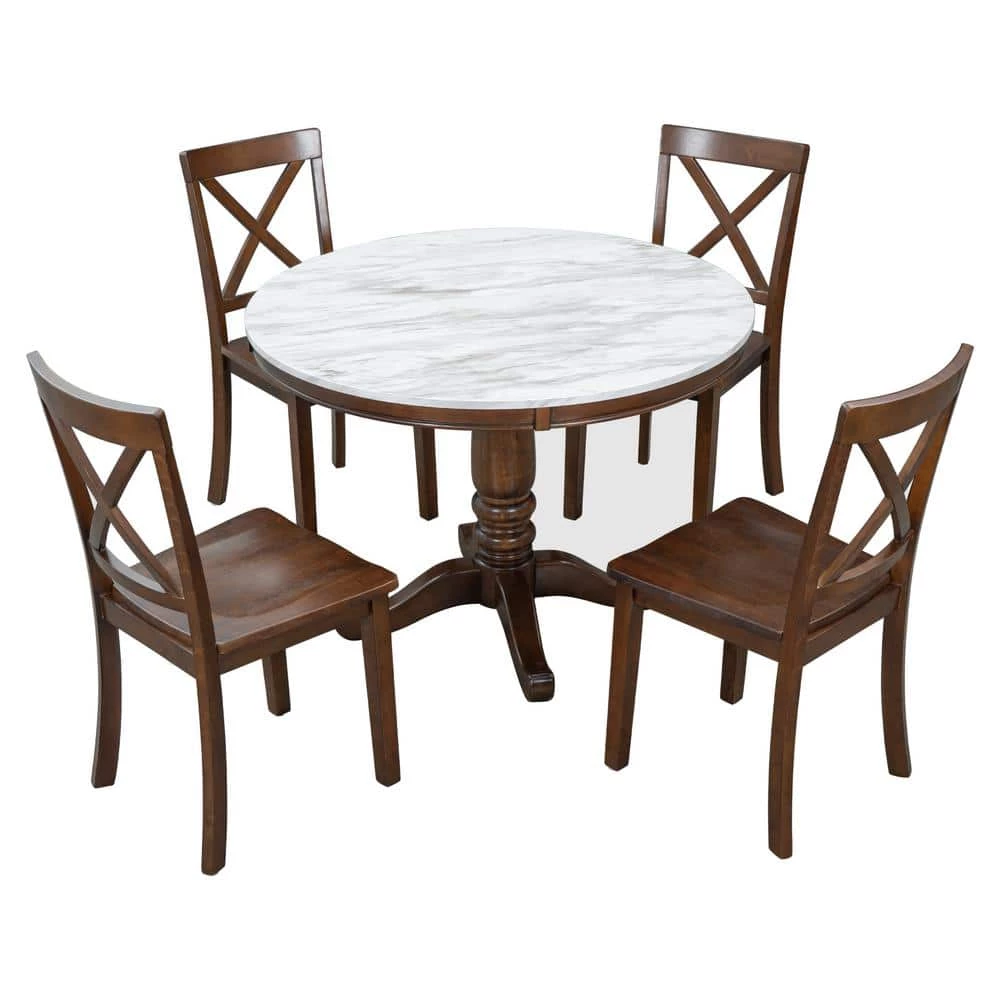 This 5-piece dining table set is elegant and simple, includes four chairs. The table with marble table veneers makes this kitchen table set more elegant and easier to clean the table top. Made from MDF, this table and chair set is very sturdy for long-term use. The natural wood grain and marble veneers are seamlessly matched with the interior decoration, showing the taste. This 5-piece dining table set is the perfect addition to your kitchen or dining room.