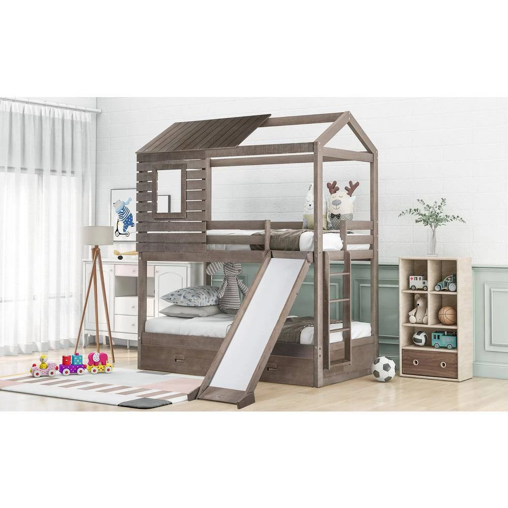 - Solid Construction Kids House Bed: the twin house bunk bed Crafted from high-quality solid pine wood can last for long time use. The upper bed and lower bed are both supported by 10 plywood slats, no box spring box is needed. The roof, drawers and slide are made from MDF boards, ensuring strong stability and durability.