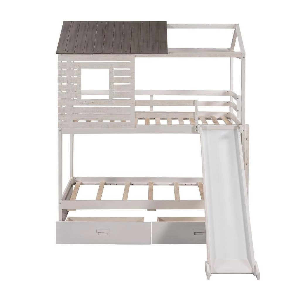 The house bunk bed comes with slide adding fun to children and meet their interactive play needs. The side ladder is very convenient for children to climb up and down. Crafted from high-quality solid pine wood, the house bunk bed frame can last for long time use. The two drawers under the house bunk bed offer storage space for clothes and bedding, which can make the most of space and help to develop your child’s habit of storage. This twin over twin bunk bed takes up minimal space for two, a perfect space-saving solution to you.