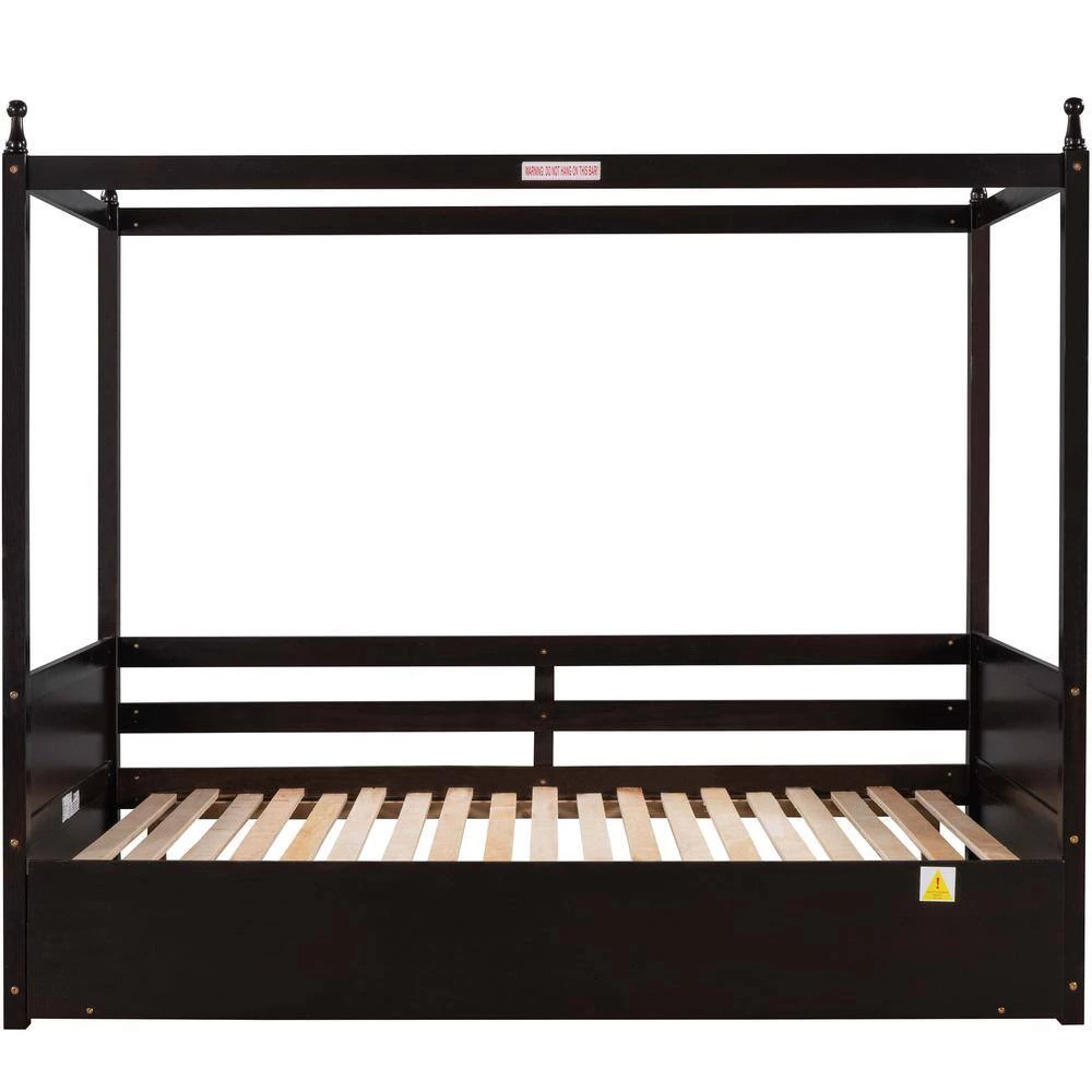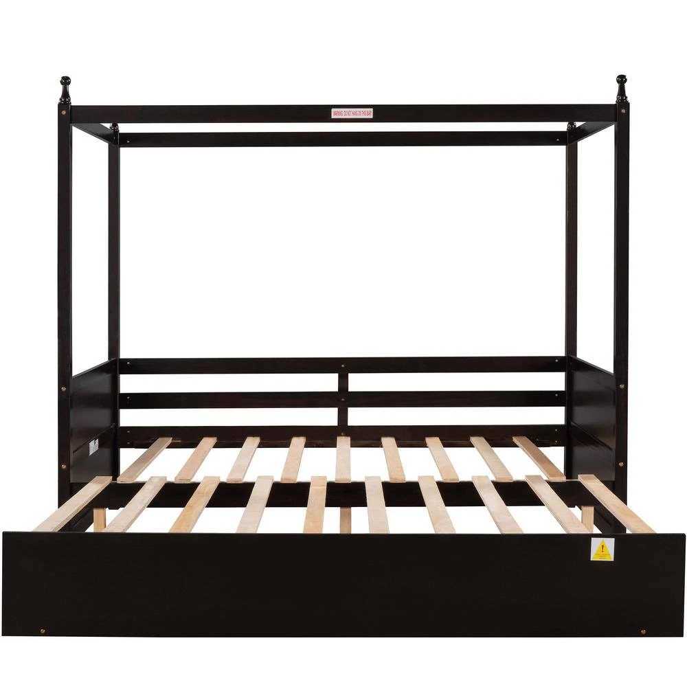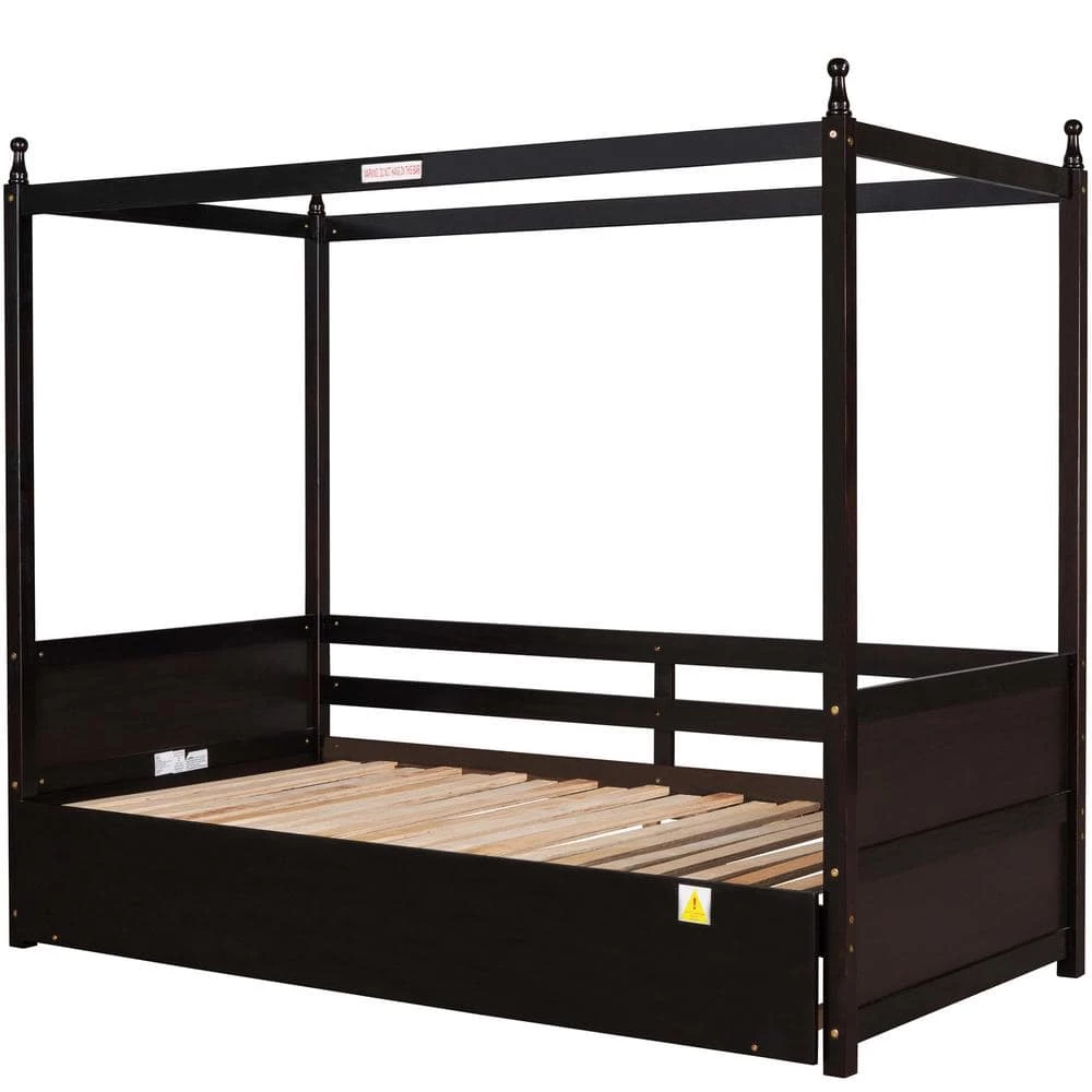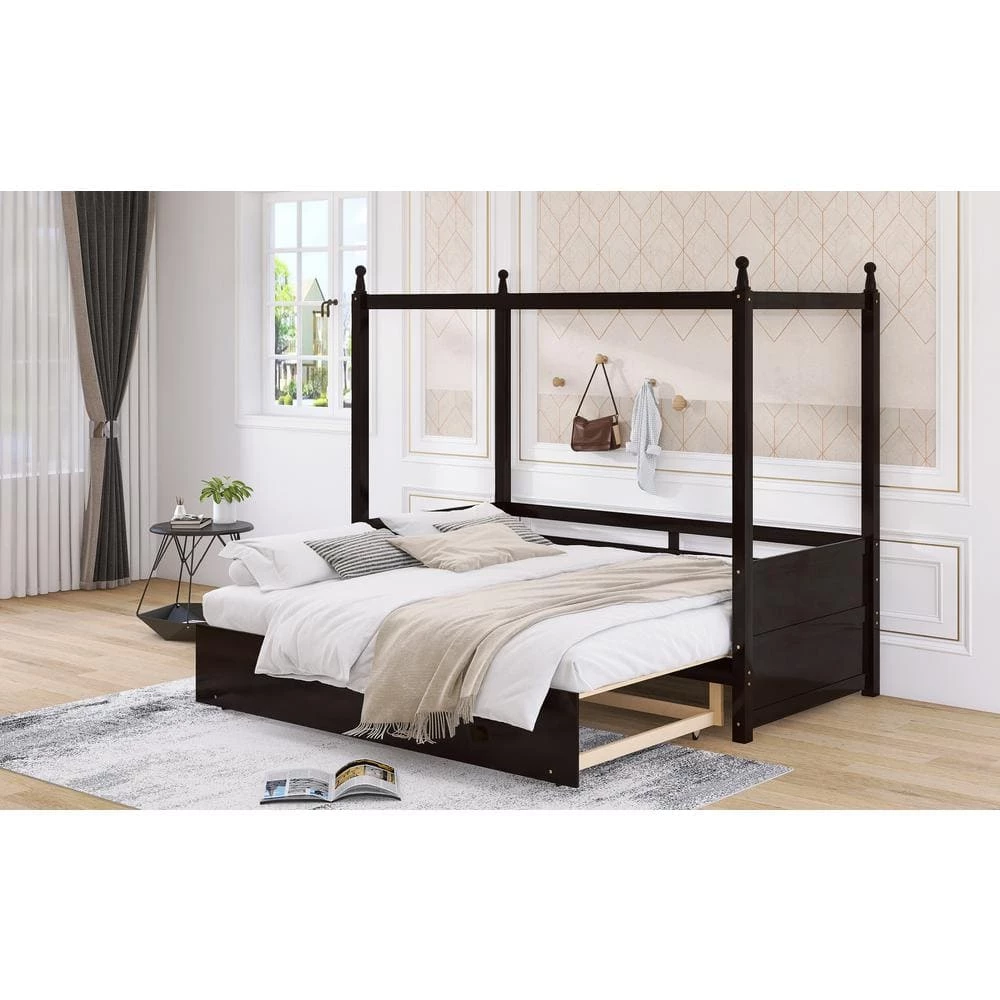 This extendable twin bed has pull out trundle. When the trundle is pulled apart, this daybed can be expanded from twin size to double twin size. The twin size is suitable for children or daily use, but when the guests arrive, extendable bed is the best choice, this functional wood canopy bed can fit all your need.