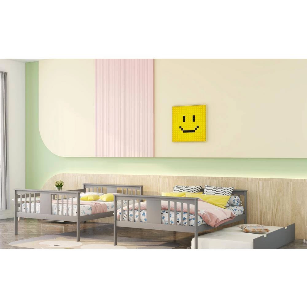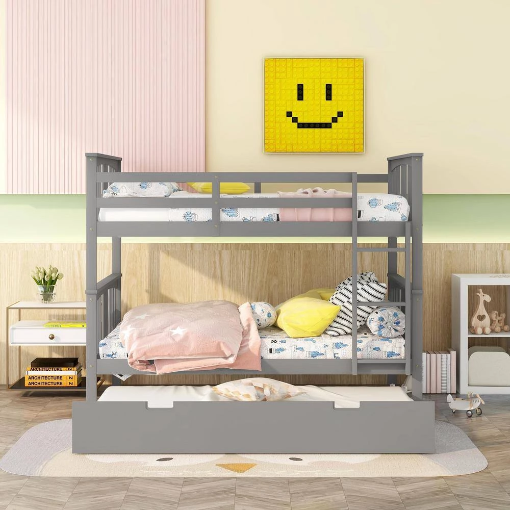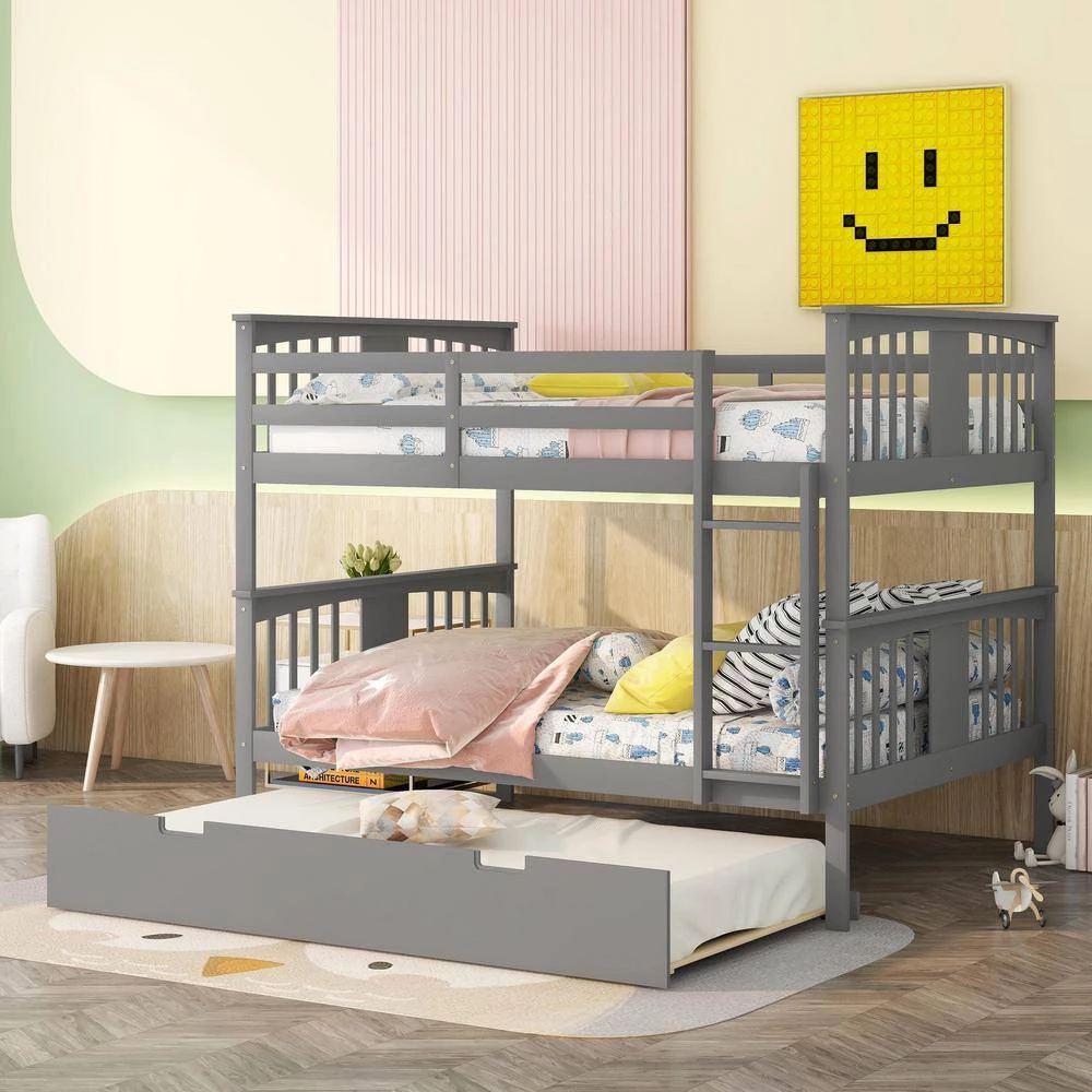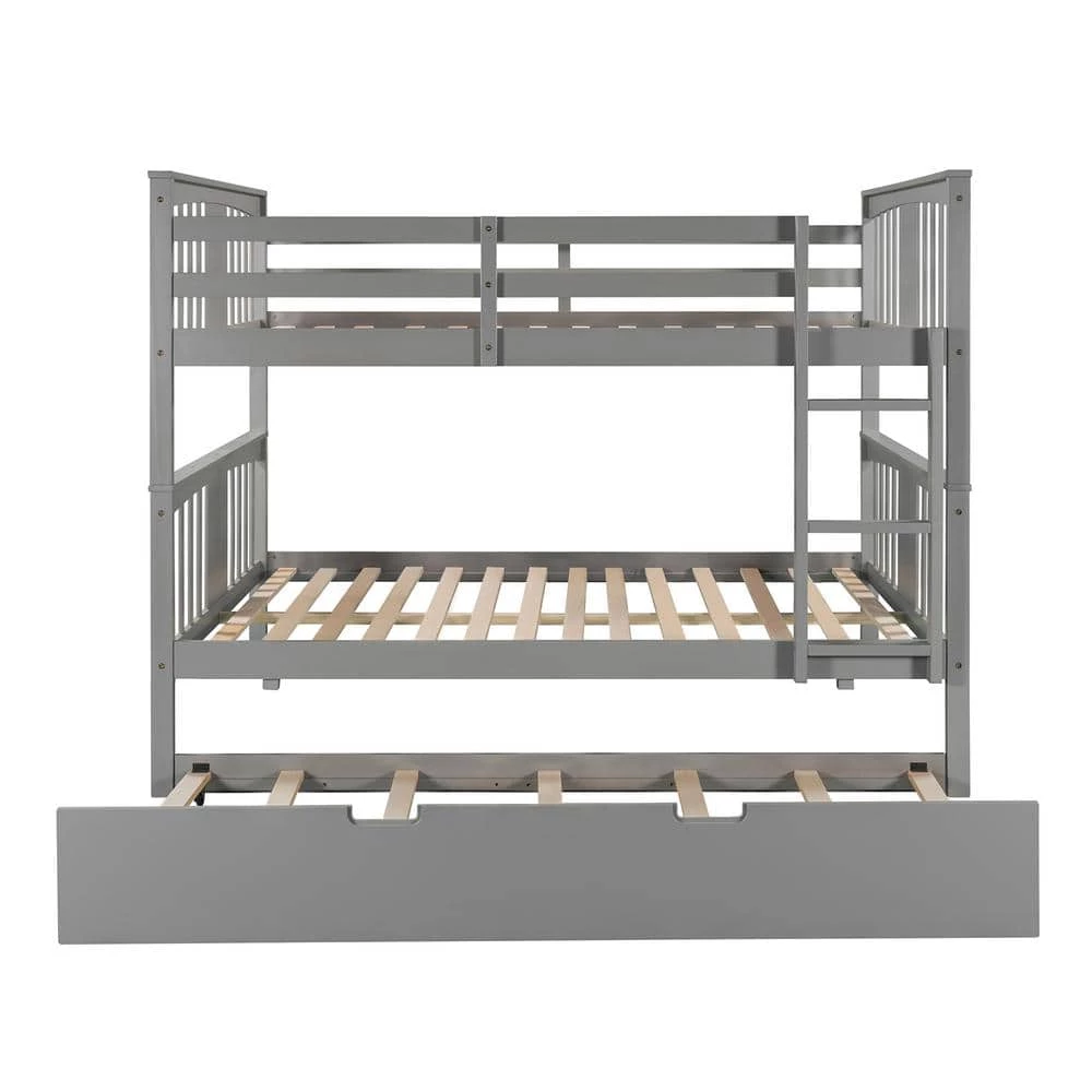 If you need extra sleeping space or your kids love sleepovers, this Full-Over-Full Bunk Bed with trundle is perfect for your home.The trundle under the bottom bed makes this piece a great option for sleepovers.High-quality, solid pine legs and a strong, durable frame ensures stability and durability for long-term use, and can be separated into two twin beds.Slat kit included so box springs are not required. This bunk bed is designed with a clean silhouette and a hue of elegance.It suits all styles of home decoration, and completes the look of any bedroom.Specifications:Product Type: Bunk BedSize: Full-Over-FullColor: Gray/White/EspressoMaterial: Plywood+MDF+Pinewood