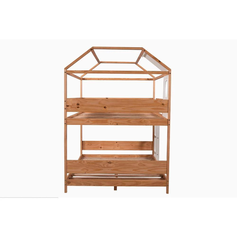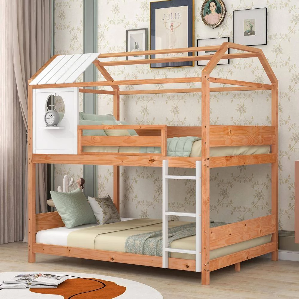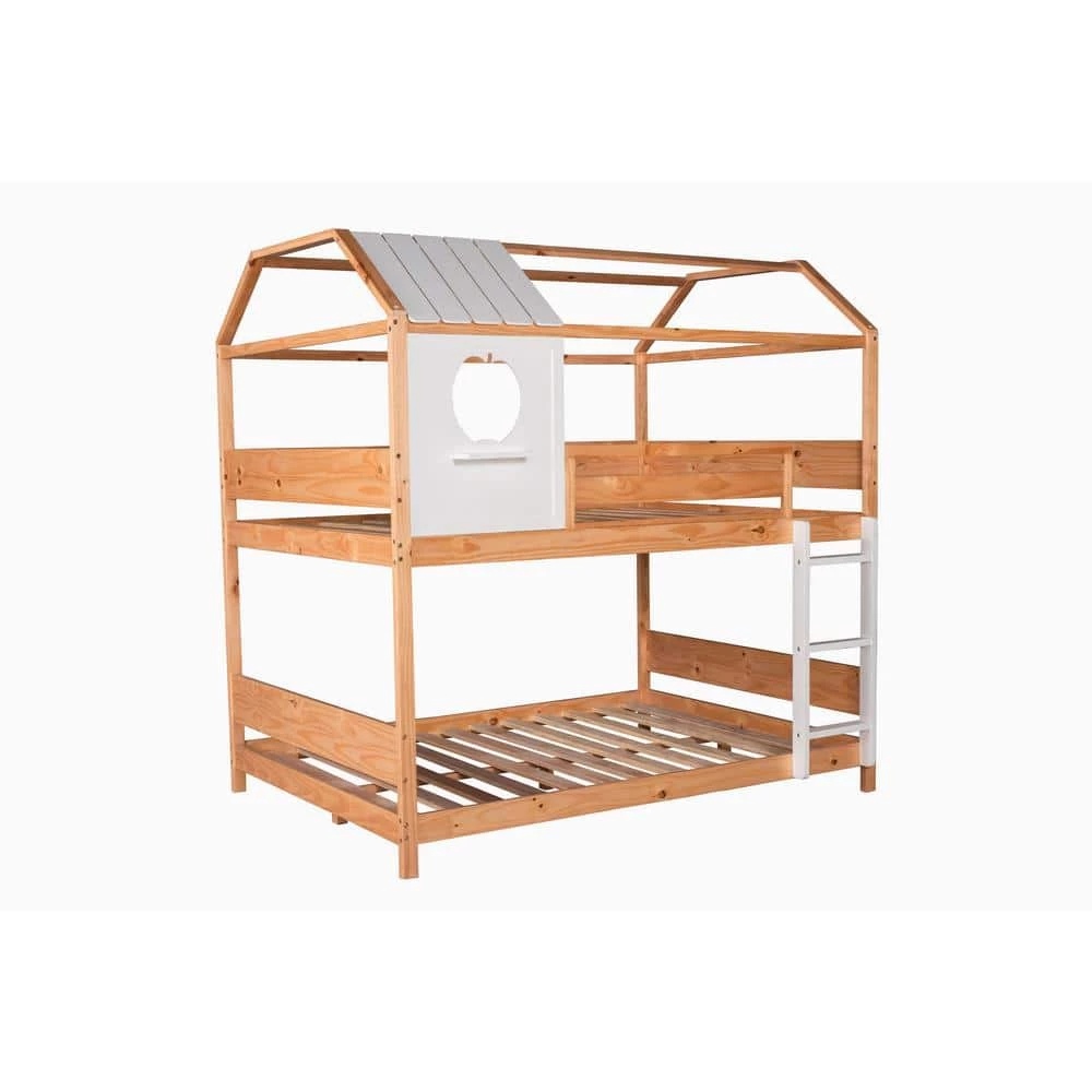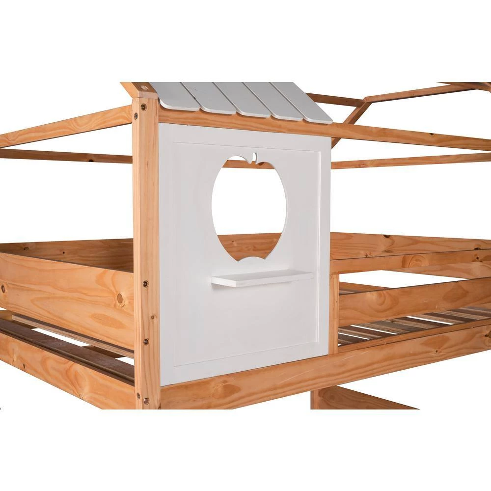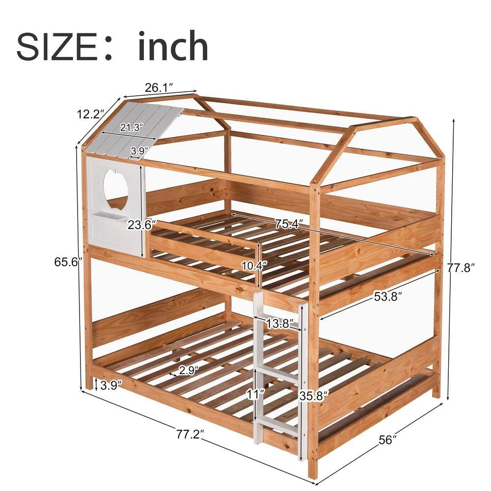 ⌂ The bunk bed features a fun house-themed design with a lovely plank rooftop and accented window. Sturdy construction ensures safe use thanks to the unique insert and locks joint structure. Slatted safety rails protect your sleep and the convenient step ladder is built into the design for stability. Transform any room with a light and playful bunk bed. A little shelf outside the window makes it easy to put small things such as an alarm clock.