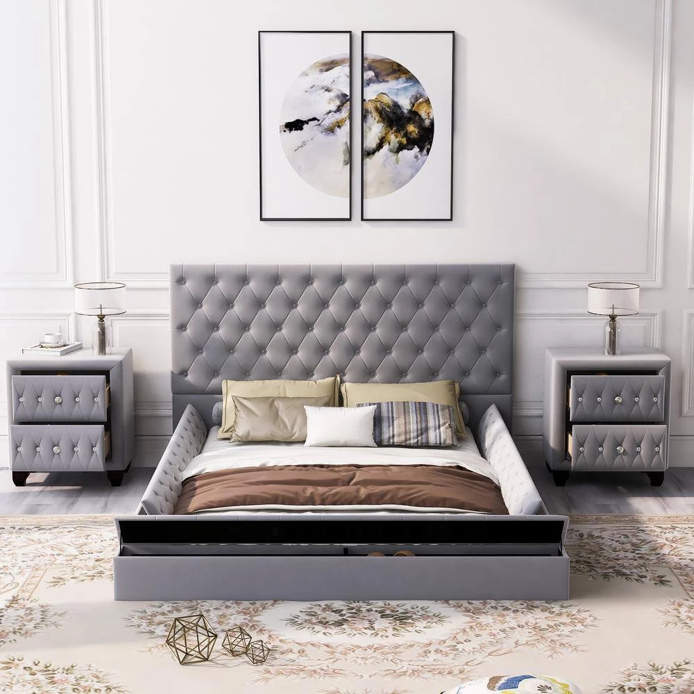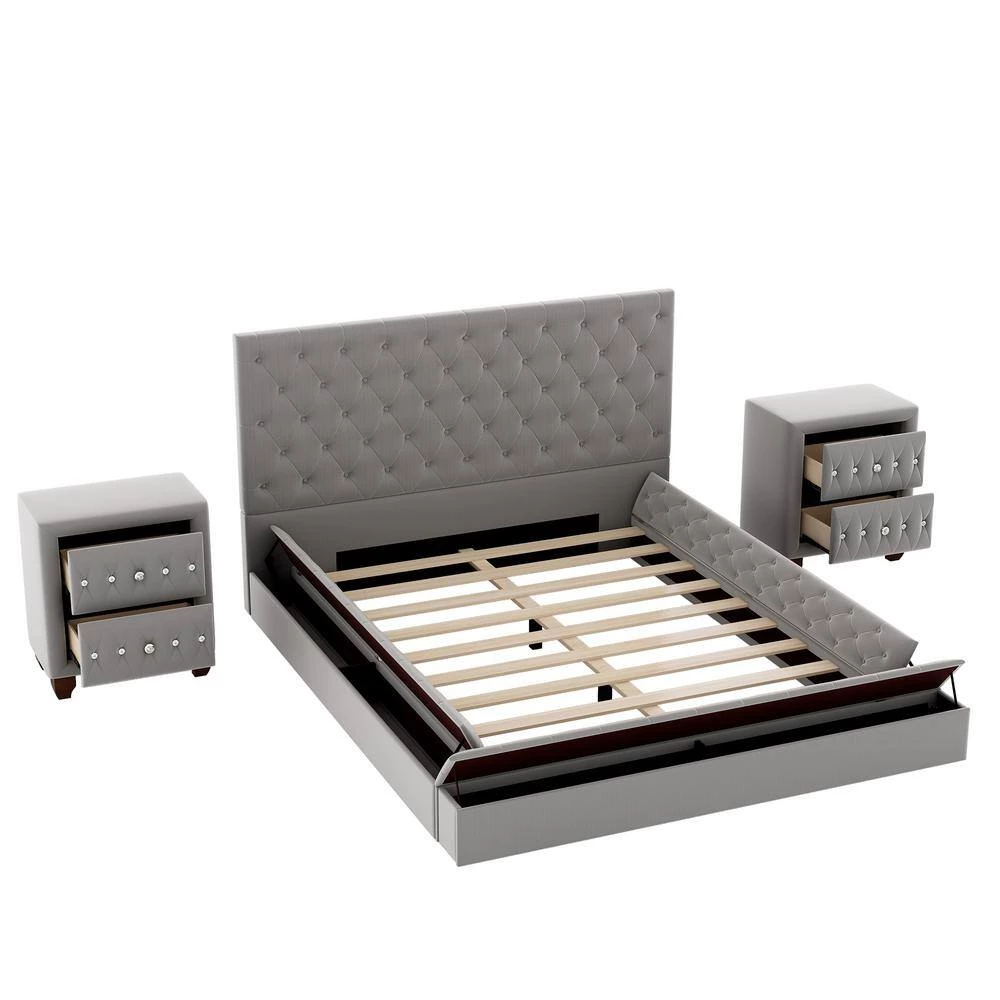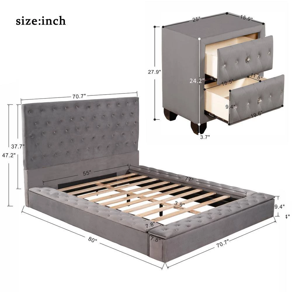 - 🏡【Upholstery Bed and 2 Nightstands】There are two storage compartments on each side of the upholstered bed and one storage compartments on the footboard, which can be used to store daily necessities. This is the perfect choice for those who like to make use of space. The nightstand frame is made of solid pine wood and MDF, filled with foam. It is wrapped by velvet, this nightstand will be a simple and practical choice.