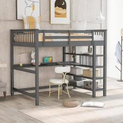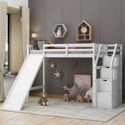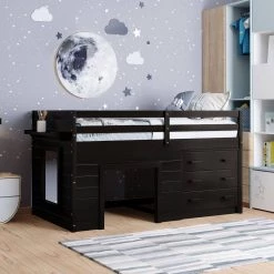 Twin Loft Bed with Wood Frame, Ladder and Child Rail for Kids, Navy Blue Finish by ANBAZAR