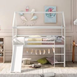 White Wood Twin Size Loft Bed Frame with Slide and Ladder, Twin Kids House-shaped Loft Bed with Roof and Guardrail by ANBAZAR