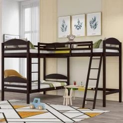 Twin Size Espresso L-Shaped Triple Bunk Beds, Twin Over Twin Wood Bunk Bed Frame with a Loft Bed for 3-Kids by ANBAZAR