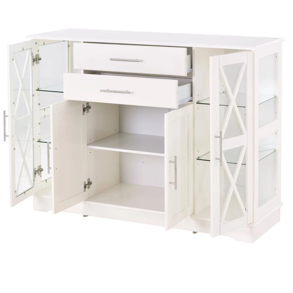 - 【Sturdy White Sideboard with Exquisite Workmanship】This accent cabinet is crafted from high-grade-certified P2 MDF with spraying high-quality white coating and the glass door is made of tempered glass, which means it’s of high quality and has a sturdy structure. Environmentally friendly lacquered surface ensures no harm and odorless.