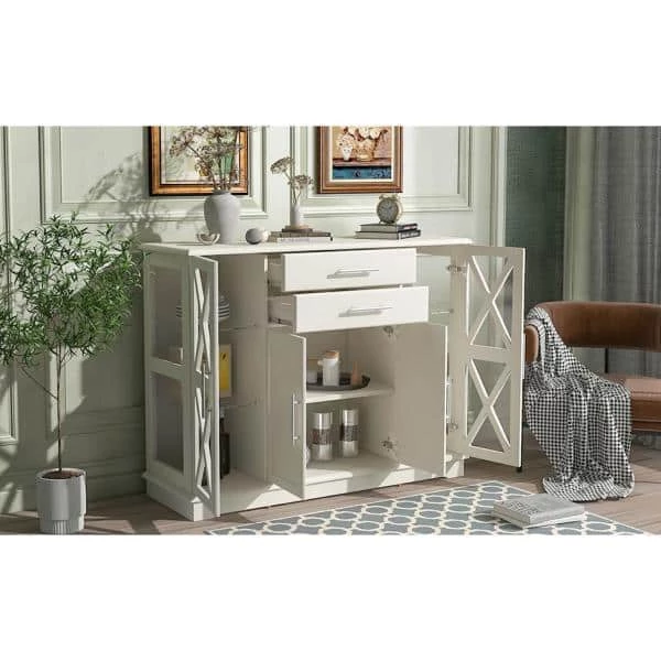 - 【Ample Storage Space】This buffet is ideal for you to storage your supplies. Featuring two large drawers for convenient to storage cutlery ,gadgetry and more. If you need more storage space, this storage cabinet buffet is your ideal choice. There are 2 adjustable shelves behind the single glass door and provide enough space for you to place craft ,dishes, toiletries, etc. Plus, The shelf behind the double-door is adjustable, so that this buffet can meet your different needs.