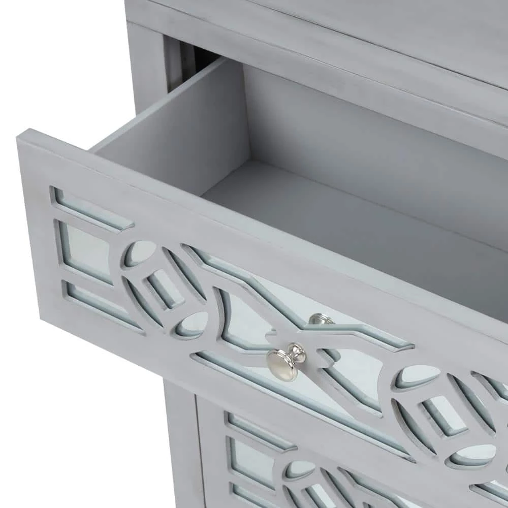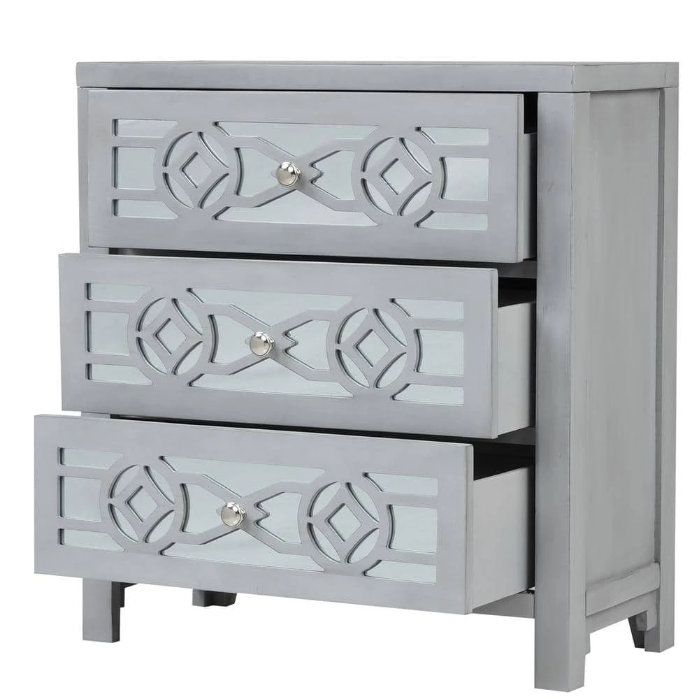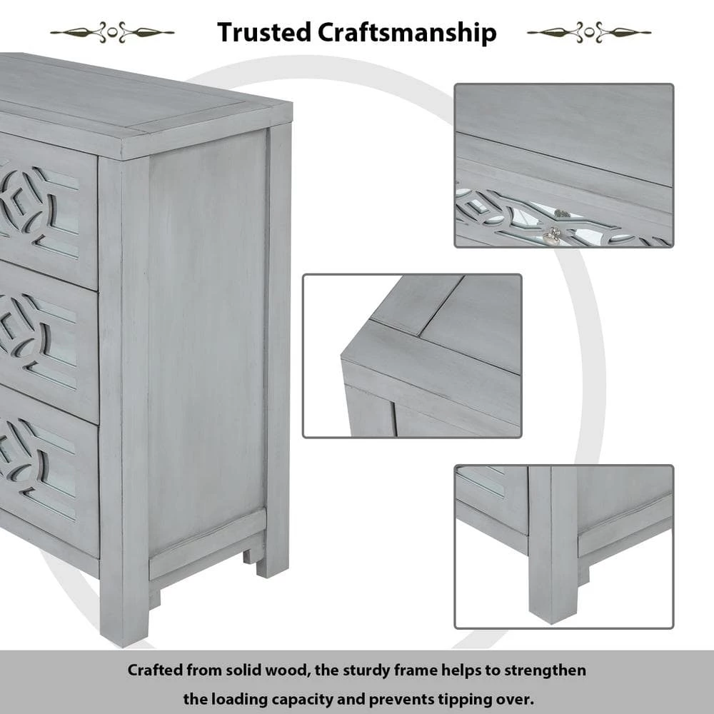 This wooden storage cabinet works well as a console table, entrance hall table or a sofa-side table, creating your own personal style effortlessly. Our accent cabinet offers color choices in Antique Navy, Antique White, Espresso, Gold and Silver to decorate your entryway, hallway, living room and bedroom, bringing storage options to your home without taking up too much space. Dimensions & Weight: Overall Dimension: 26″L x 12.2″W x 28″H Overall Weight: 34.4 LBS Weight Capacity: Tabletop: 144 LBS Drawer: 11LBS Material: Solid wood frame and legs MDF panels Thickness: Tabletop: 18mm Finish: Distressed Finish Color Options: Antique Navy, Antique White, Espresso, Gold, Silver The three built-in drawers offer you complete and total convenience to organize your possessions. While the spacious tabletop can be used to display ornaments, patted plants, and other items. Stylish Appearance– Geometric patterning and a decorative mirror, silver metal handy knobs. Crafted from solid wood, the sturdy frame helps to strengthen the loading capacity and prevents tipping over.