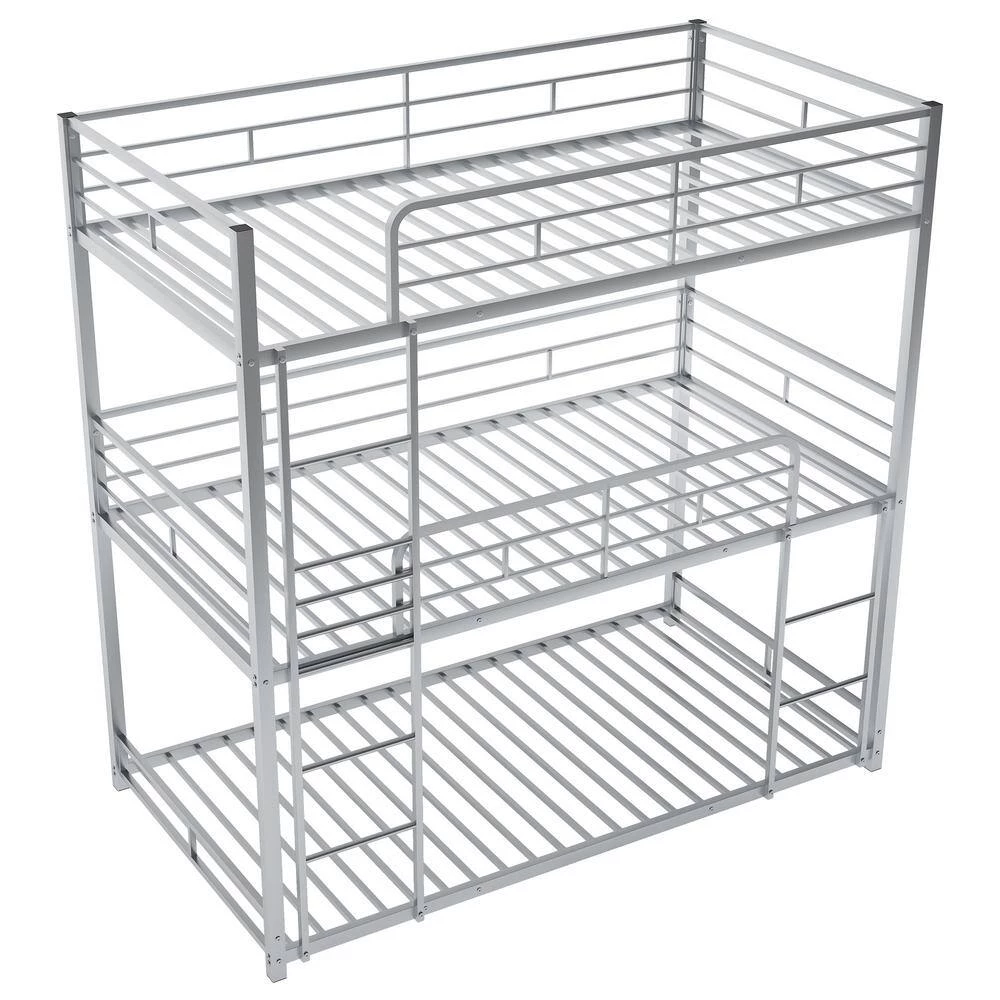 - 【High Quality Triple Bunk Bed】Twin size triple bunk bed is made of heavy duty steel, which provides great support. It is equipped with easy access metal guardrails to keep your kids sound and secure. It can withstand the test of time and will not make any noise or wobble after many years. 21 secured metal slats for each bed provide great support, and no box spring is needed.