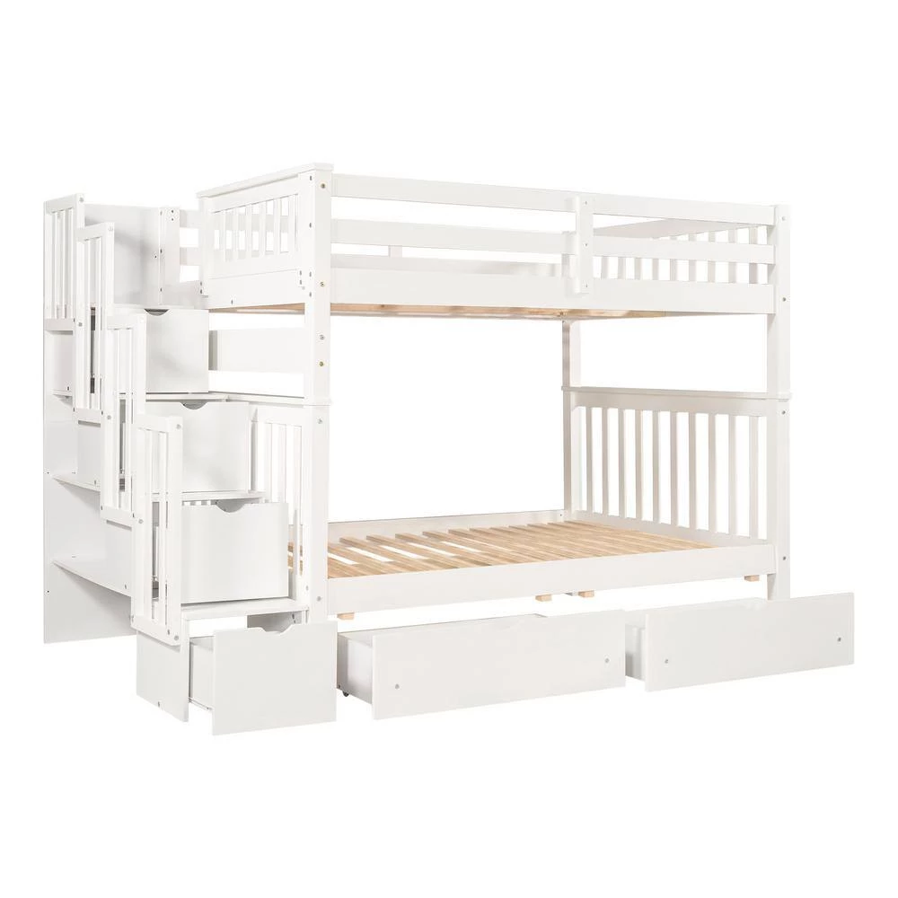 If you need extra sleeping space or your kids love sleepovers, this Full Over Full Bunk Bed with Shelves and 6-Storage Drawers is perfect for your home. Open shelves located beneath the attached staircase provide ample storage for your little ones’ toys and books. 2-drawers under the bottom bed and four hidden drawers under the stairs provide ample storage for your little ones’ toys and bedding. High-quality, solid pine legs and a strong, durable frame ensures stability and durability for long-term use, and can be separated into 2-full-size platform bed. Slat kit included so box springs are not required. This bunk bed is designed with a clean silhouette and a hue of elegance. It suits all styles of home decoration, and completes the look of any bedroom. Size: Full over Full. No Box Spring Needed. Adults Assembly Required. Material: Plywood plus MDF plus Pinewood. Overall Product Dimension: 96.8 in. L x 56.7 in. W x 67 in. H., Number of Package: 4. Number of Slats: 10 for each bed. Overall Product Weight: 320 lbs. Weight Capacity: 250 lb. for the top bunk and 300 lb. for the bottom bunk.