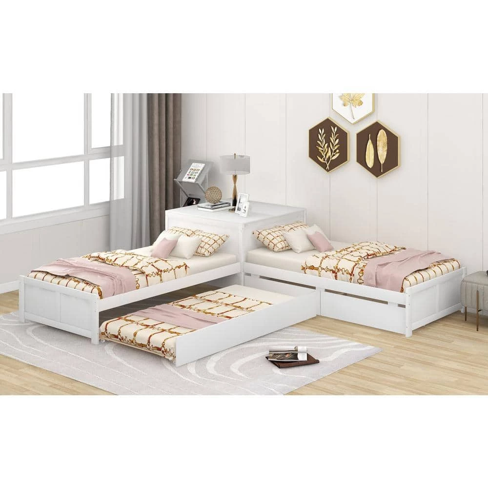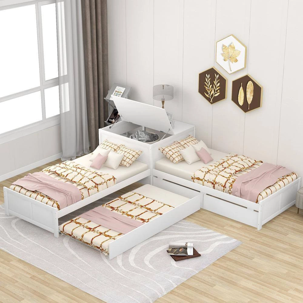 The unique L-shaped platform beds offers a space-saving design which can accommodate 3 people. With a trundle, two drawers, and built-in square table, this special bed is configured to fit in the corner of the room. Two drawers under the bed are designed to store daily necessities like socks or clothes. Built-in square table in the middle of these two twin beds offers both more durability and functionality which can be used as a nightstand.