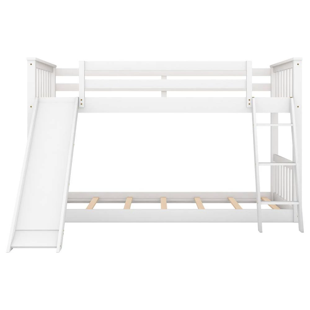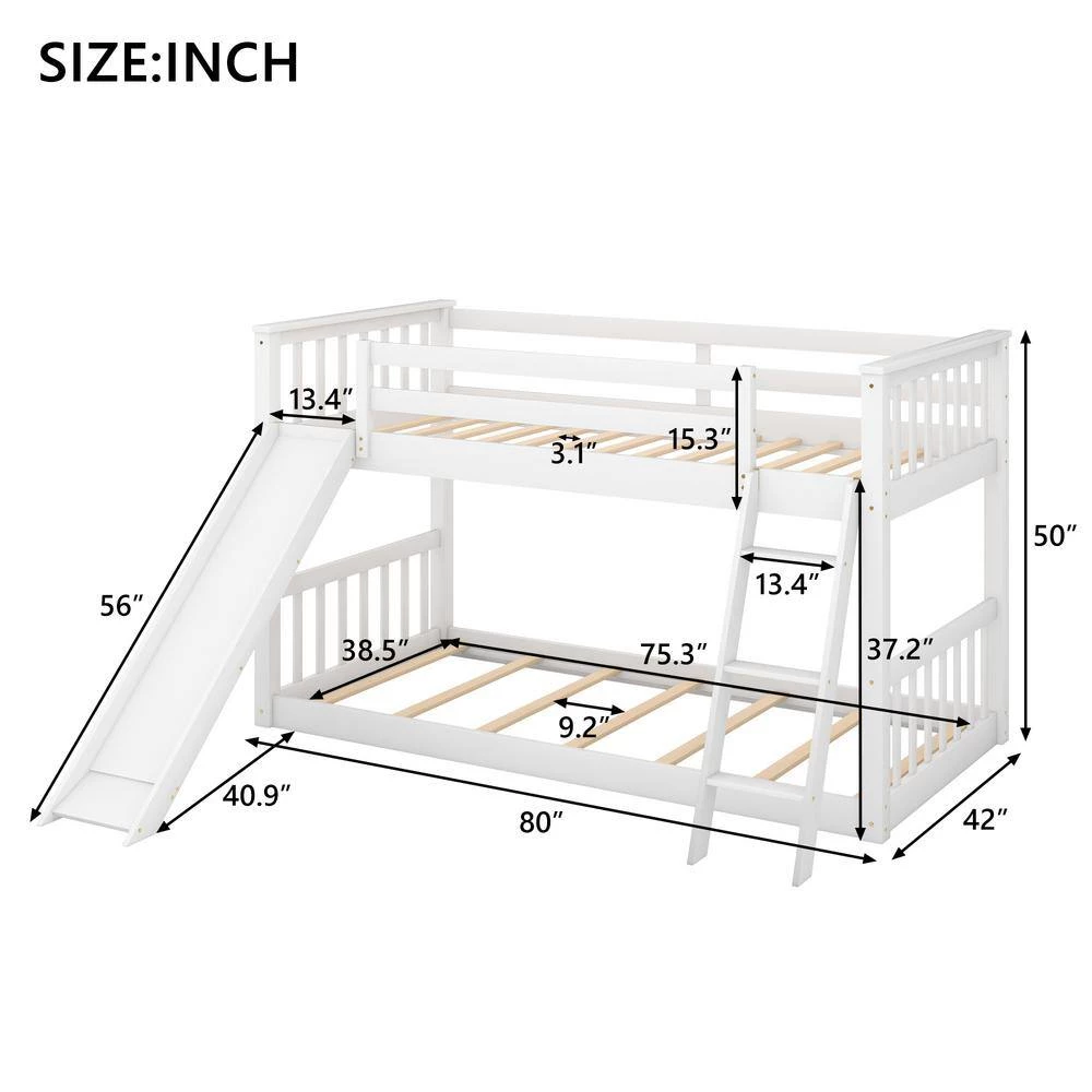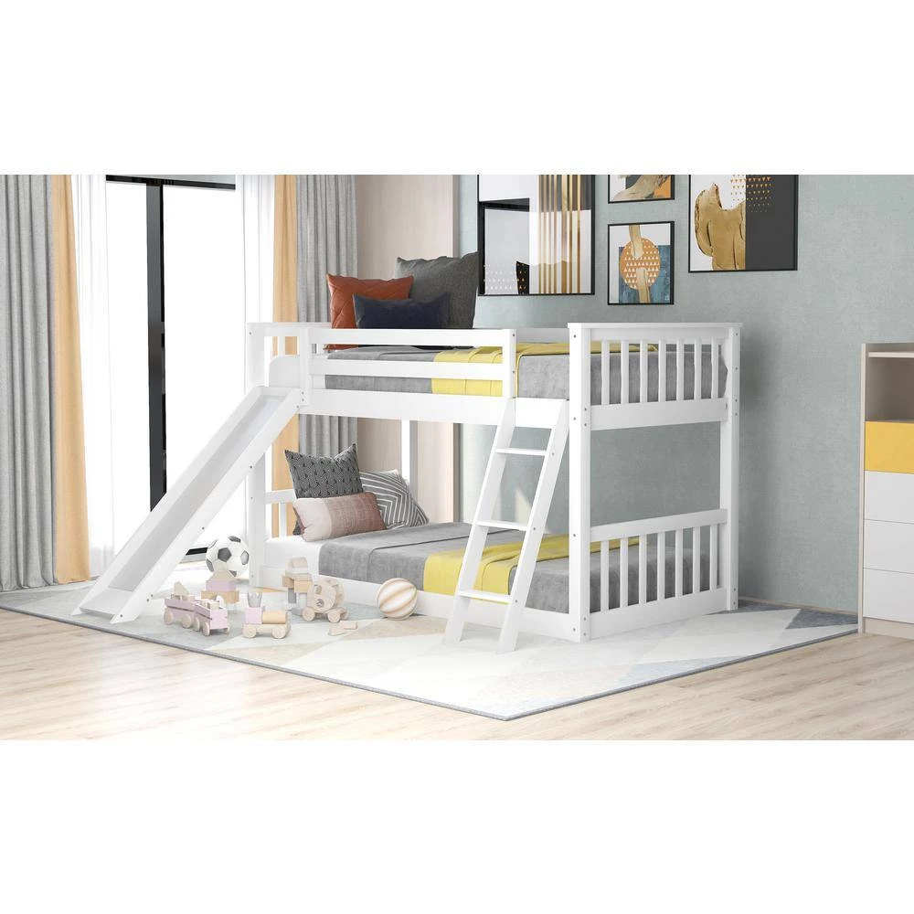 - 【Low Bunk Bed with Slide】This kids twin over twin bunk bed is equipped with built-in angle ladder and slide. It is easy for children to climb up and down from the top bed. Featuring a low slide for kids to play, this wood bunk bed can add fun to children and develop their sense of balance and coordination. Functional and aesthetic, this floor bunk bed will enhance any bedroom.