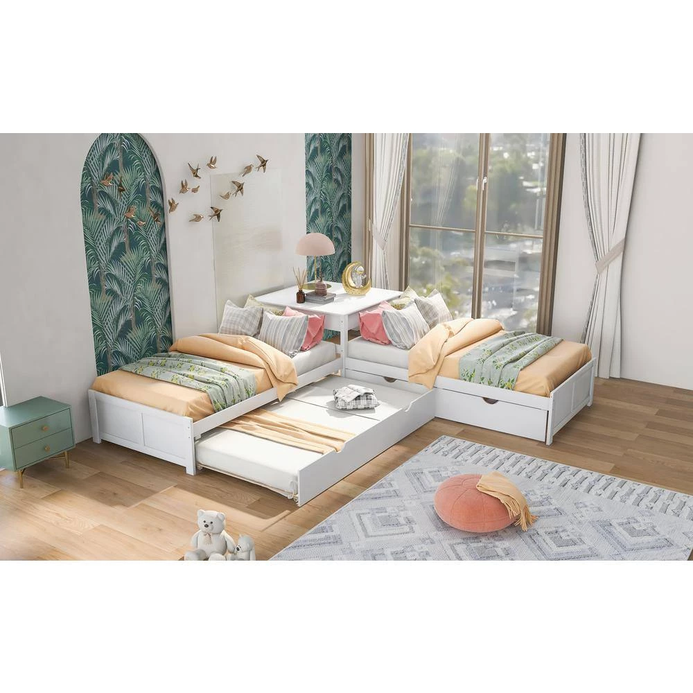 The unique L-shaped platform bed s offers a space-saving design which can accommodate 4 people. With two trundles and the built-in square table, this special bed is configured to fit in the corner of the room. Built-in square table in the middle of these two twin beds offers both more durability and functionality which can be used as a nightstand.