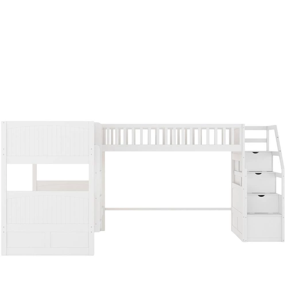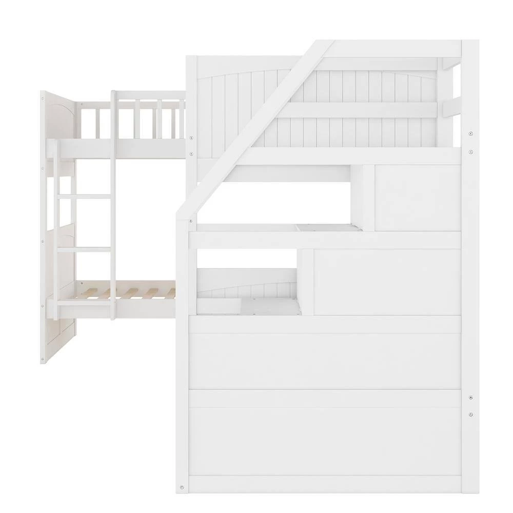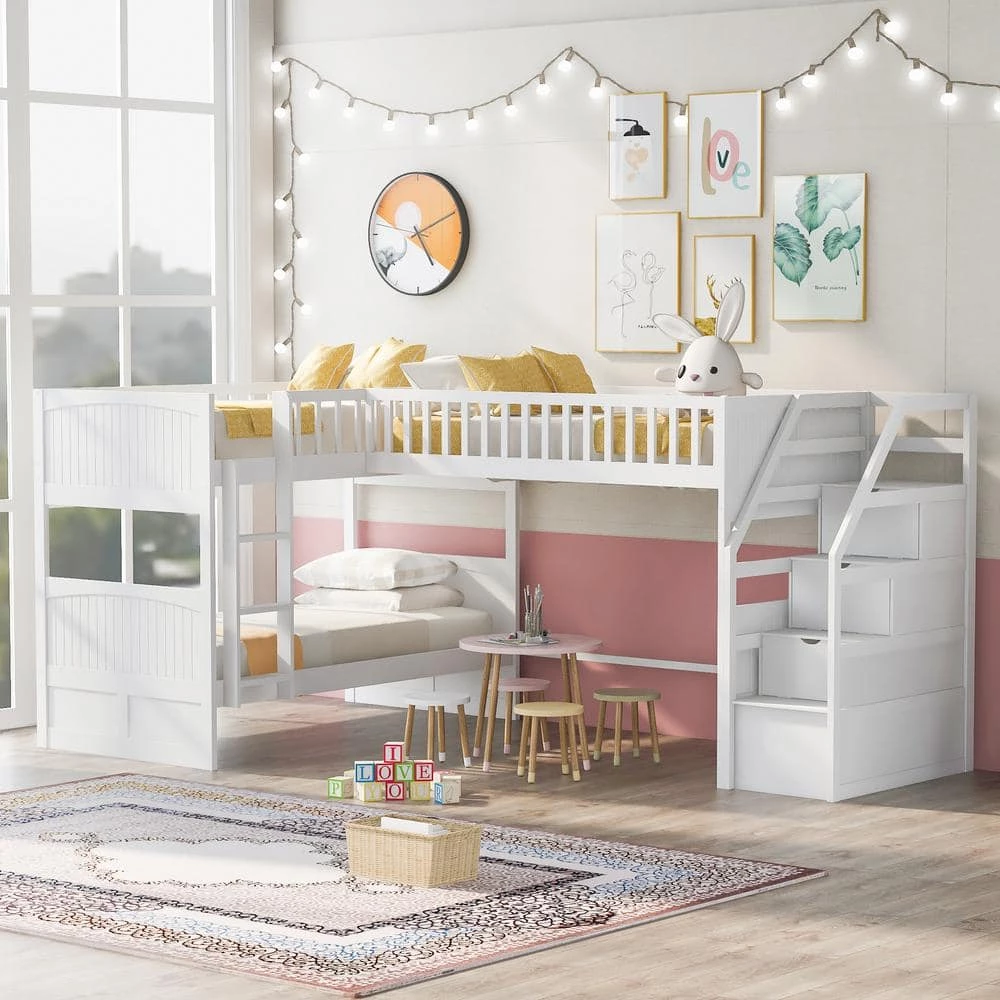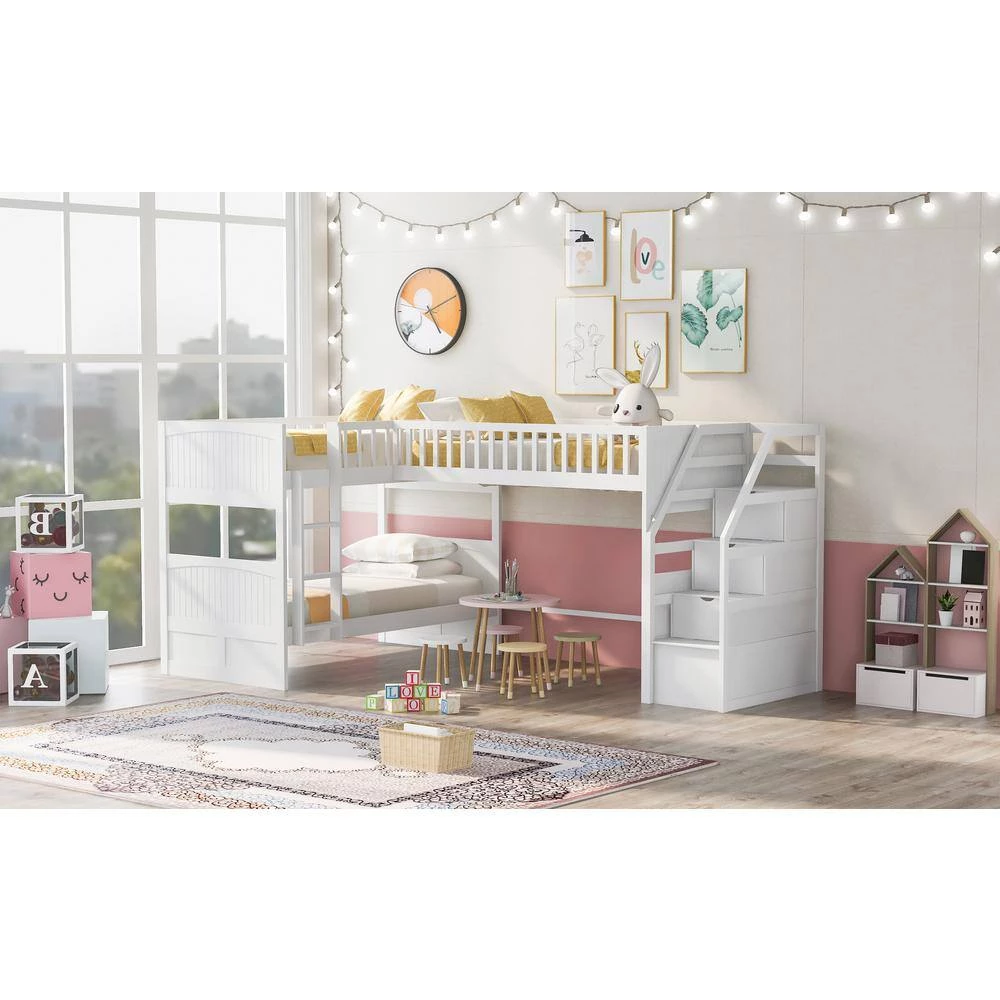 - 【L-Shaped Bunk Bed with Loft 】This L-Shaped bunk bed features two twin stacked bunks and one attached twin loft bed with built-in ladders to ensure safe access to upper bunks. The clearance space under the loft bed can be used as play or study area with desk.