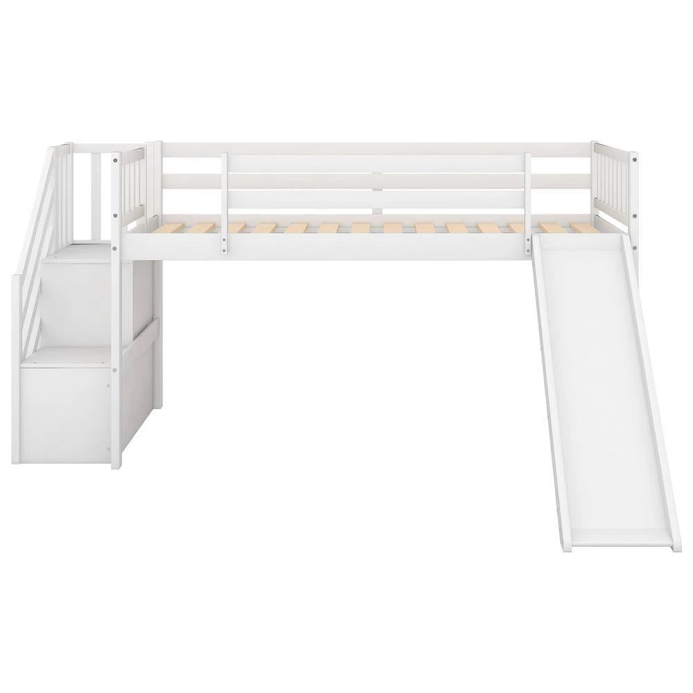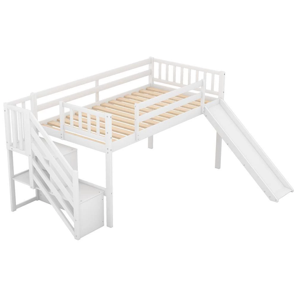 This twin size low loft bed is quite a space-saver and it comes with a playful, functional and convenient design for your room. It frees up floor space for storage or play and the staircase helps save storage space as well. This bed features a sturdy slide which can be installed on both sides. This low loft bed suits for those families who has low ceilings, and also fit those have small children, especially toddlers.