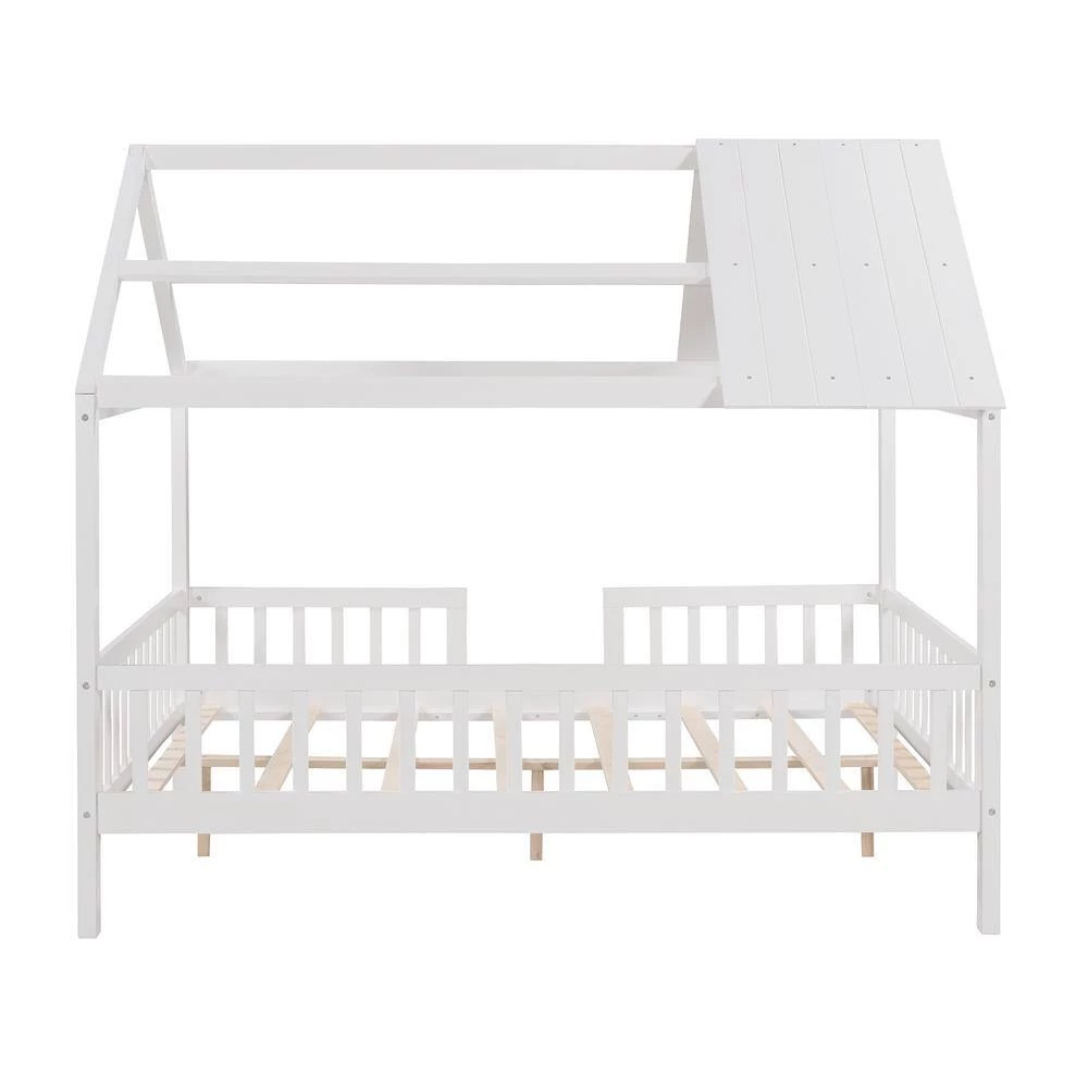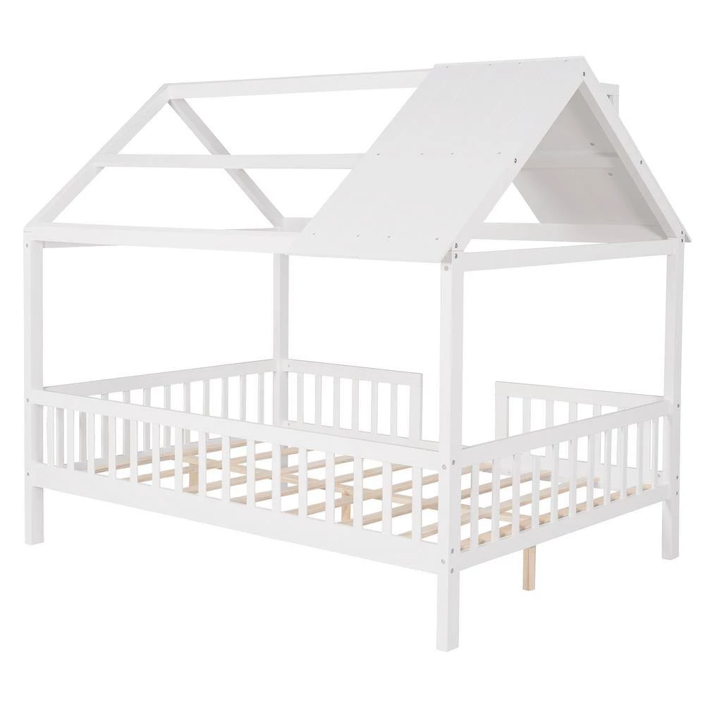 This Full size house bed features roof and fence. This unique bed creates a fun and adorable space that not only serves as a comfortable sleeping area but also double as a space for your kids to play and have fun. This bed with fence and sturdy wooden frame provides a safe space for your child to sleep well. the front and rear rails can also be used for decoration.